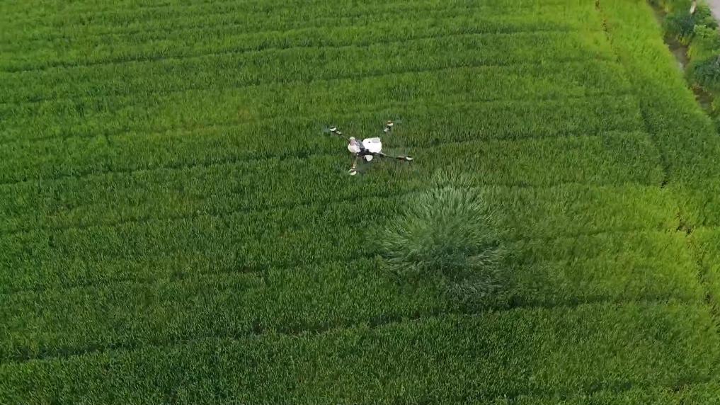 在杭州市蕭山區(qū)義橋鎮(zhèn)的皇天畈麥田,連片麥田長勢(shì)喜人。現(xiàn)場,無人機(jī)正在開展小麥病蟲害防治作業(yè)。